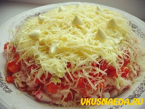 Формируем слоями салат, каждый промазывая тонким слоем майонеза: