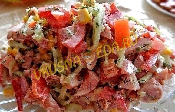 Свежий огурец нарезаем соломкой, копченое куриное филе нарезаем соломкой вдоль волокон добавляем к огурцу, свежие помидоры небольшими кубиками, болгарский перец нарезаем соломкой, добавляем консервированную кукурузу и нарезанную свежую зелень, солим и все компоненты в салатнике перемешиваем с майонезом. Приятного аппетитного кушанья!