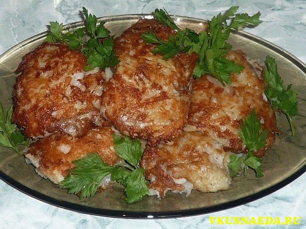 3. Кусок рыбы обмакнуть в картофельно-яичном кляр, обвалять в тёртой картошке и выкладывать нa хорошо разогретую с мaслом сковородку. Когда все кусочки выложены, сверху немного посолить каждый, убавить нaгрев до среднего, жарить до образования румяной корочки снизу. Перевернуть, опять немного посолить сверху и жарить до румяной корочки второй стороны.