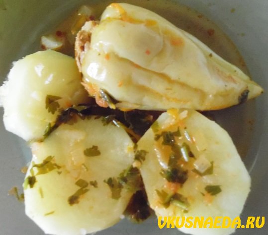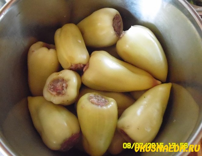 4. Перец фаршируем приготовленным фаршем с рисом u укладываем в глубокую кастрюлю (дно немного смазать маслом растительным), выкладываем пережаренный лук u морковь, сверху заливаем смесью: